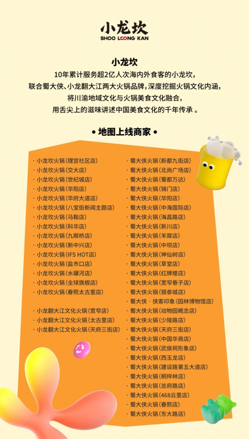 此次活动以交子大道为中心,联动 3 个核心商圈-合景·悠方、天府大悦城、麓湖商业/麓镇商业以及成都火锅品牌蜀大侠等上百家优质门店,打造“撮一顿”、“喝一杯“、”逛一下“三条不同寻宝路线,等待大家开启春糖美好生活的探索之旅!