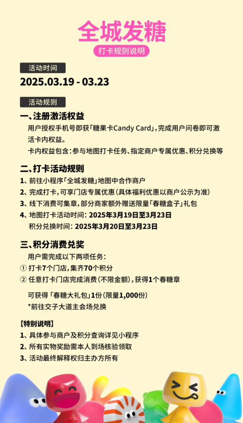 在春糖生活季开启之际,“全城发糖”城市地图打卡活动也提前上线,参与活动,将有机会获得餐饮消费券、生活休闲券、潮流用品兑换等多种类型的优惠福利!更可领取“全城发糖大礼包”。
